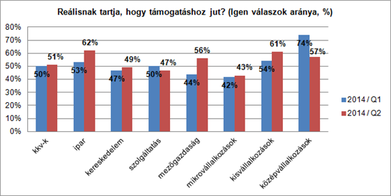 „Ezt támasztja alá az is, hogy a megkérdezett vállalkozások közel egyharmada (29%) nyilatkozott úgy, hogy beruházási terveivel megvárja az új költségvetési ciklusban pályázható forrásokat” – tette hozzá a szakember. A különböző ágazatok eltérő véleményen vannak az uniós pályázatok elérését illetően. Az előző negyedévhez hasonlóan az ipari, építőipari cégek közül tartják legtöbben (63%) reálisnak, hogy uniós forráshoz jutnak a jövőben. A mezőgazdasági vállalkozásoknál ez az arány 56%, ami jelentős, 12 százalékpontos ugrás az előző negyedévhez képest. A kereskedelmi és szolgáltató cégek várakozásai ehhez képest visszafogottabbak, kevesebb mint felük – 49% és 47% – tartja reálisnak uniós pályázat elnyerését.