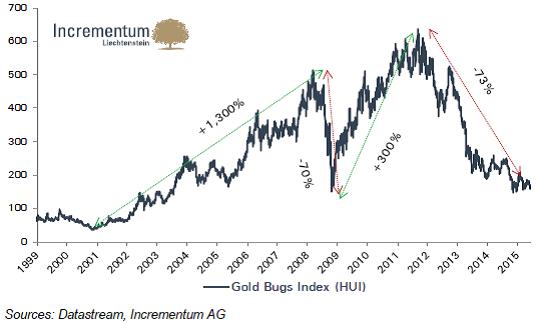 A hagyományosan évente egyszer, általában június végén megjelentetett In Gold We Trust című, az idén 140 oldalas elemzés előző, 2014. évi publikálásakor a Gold Bugs Index (HUI) 233 ponton állt. Ám a 2015-ös jelentés június 25-ei nyilvánosságra hozatalakor már csak 152,58 ponton. Tanulmányukban Stöferle és Valek tényekkel próbálja alátámasztani azon véleményét, miszerint az aranybánya-részvények zuhanásának vége. Bár ebben rövid távon tévedtek, hiszen az index azt követően még tovább esett, s augusztus 5-én 104,85 ponton érte el eddigi mélypontját, mégis érdekes lehet a neves szerzőpáros okfejtése arról, mitől várják az aranybánya-részvények drágulását. Már csak azért is, mert a HUI most éppen felfelé tart, október 7-én például 126,07 ponton zárt.