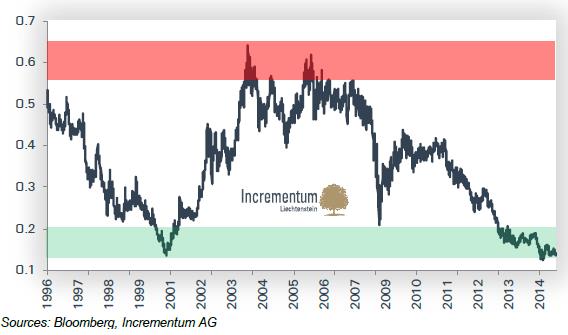 Az, hogy az aranybánya-részvények relatíve drágák vagy olcsók, szakértők általában az alapján szokták meghatározni, hogy az aranybánya-részvények mozgását leképező HUI index hogyan viszonyul a sárga nemesfémhez. Az alábbi grafikonon a zöld sáv jelzi azt az időszakot, amikor az aranybánya-részvények az aranyhoz viszonyítva extrém alacsony szinteken álltak, míg a vörös azt, amikor kiugróan magasakon. Márpedig – amint látszik –, az aranybánya-részvények éppen most jelentősen alulértékeltek az aranyhoz képest. Hasonlóan mélyen ezt megelőzően utoljára 2000-2001 környékén tanyáztak.