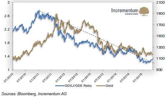 A legnépszerűbb tőzsdén kereskedett befektetési alapok (ETF) árfolyammozgását jelző indexek közül az egyaránt a New York-i tőzsdén jegyzett Market Vectors Gold Miners (GDX) és a Junior Gold Miners (GDXJ) indexeinek egymáshoz viszonyított aránya jól mutatja az aranybánya-szektor iránti befektetői étvágyat – véli a Stöferle-Valek páros. Míg a GDX alapvetően a vezető, addig a GDXJ a junior és small cap cégek részvényeit tartalmazza. Ha a kettő aránya emelkedik, az növekvő kockázatvállalási/befektetési kedvet jelez. Jelenleg e ráta egy dupla-alj formációt kezd kialakítani. Márpedig csökkenésük idején a GDXJ egyértelműen jobban megtámasztott, mint a GDX, miután a befektetők türelmesebben szemezgetnek a junior aranybánya-részvényekből, amikor azok ára alacsony, mint a nagybányákéiból. Persze adva a bányarészvények viszonylag alacsony likviditását, így is időbe telhet, amíg jelentősebb állományt tudnak felhalmozni. A likviditás ugyanis a nagyobb eséseket követően csökken, s csak a következő rally idején kezd növekedni. Ebből az következik, hogy a nagybefektetőknek könnyebb eladni magas árfolyamon, mint venni alacsonyan.
