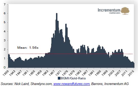 Hogy mennyire alulértékeltek az aranybánya-részvények, az igazából hosszabb távra visszatekintve tűnik fel. Mindenekelőtt a világ legrégebbi aranyindexe, a Barron Gold Mining Index (BGMI) aranyhoz viszonyított értékéből. E ráta mostani, 0,4 pontja több mint 70 éve a legalacsonyabb, az jóval elmarad az 1,56 pontos hosszú távú átlagtól. (A történelmi mélypontot egyébként 1942-ben érte el, a Pearl Harbor-i támadást követő kisebb tőzsdei összeomlást követően.)