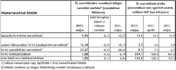 A háztartásoknak nyújtott lakáscélú hitelek átlagos kamatlába májusban először csökkent 10 százalék alá 2011. február óta, 9,96 százalékon állt, 12 bázisponttal az egy hónappal korábbi szintje alatt. Az év végi szintnél 108 bázisponttal voltak olcsóbbak a lakáshitelek és az egy évvel korábbihoz képest 2,12 százalékponttal estek.