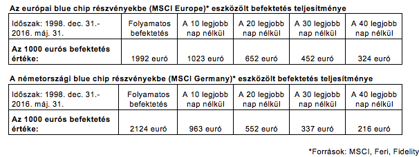 Ugyanez mondható el a német részvénypiacról is. Ha valaki 1998 végén 1000 eurót fektetett az MSCI Germany indexben szereplő német bluechip értékpapírokba, 2016. május végére már 2124 euróval rendelkezett. Az időszak 10 legjobb napját nem számítva 963 eurót, a legjobb 40 napot kihagyva pedig mindössze 216 eurót ért volna a befektetése 2016. május végén.