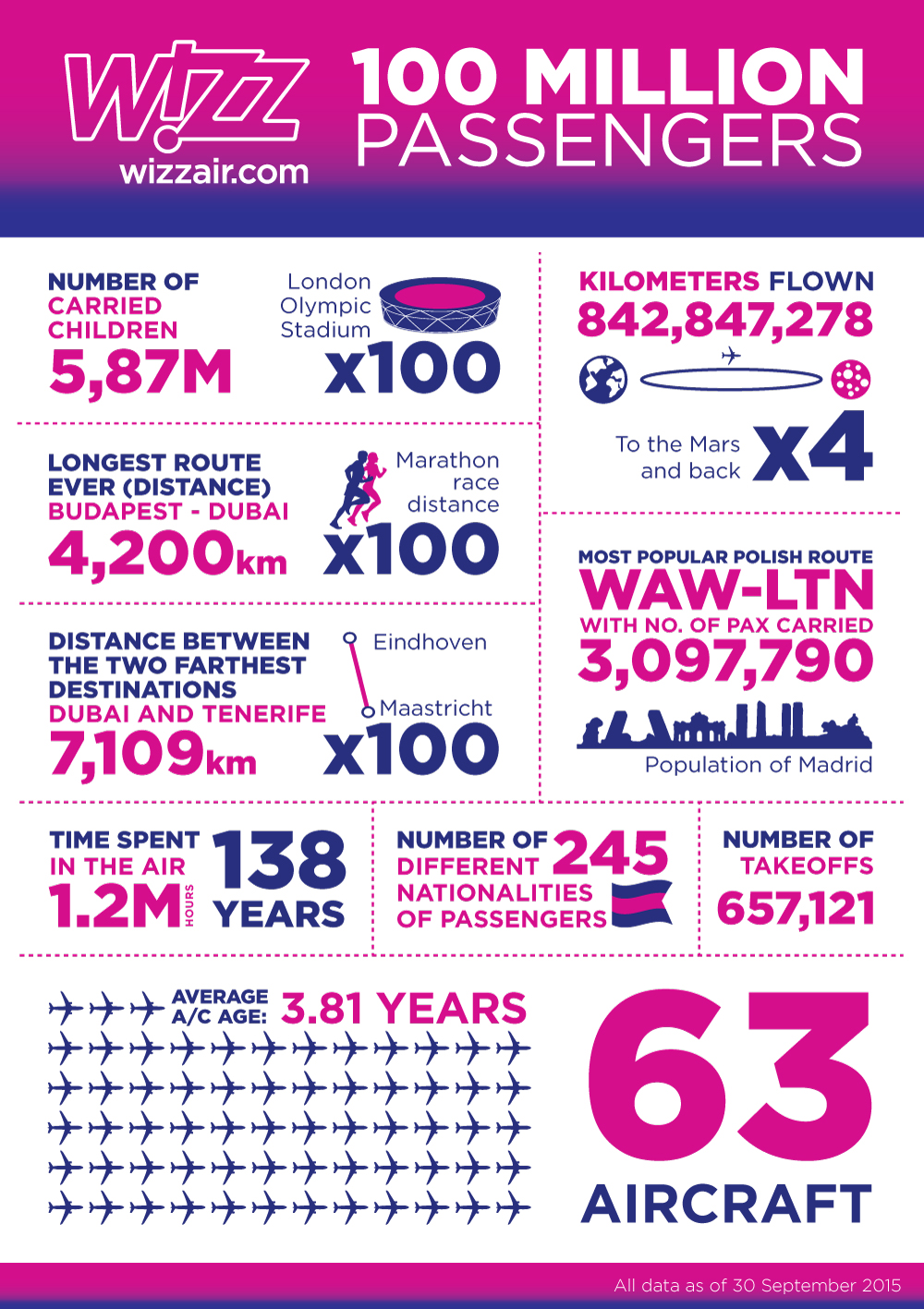 A 100 milliomodik utas a légitársaság London-Lutonból Varsóba tartó útvonalán utazott. A WIZZ a fedélzeten tartózkodó összes utast meglepte egy ingyen repülőjeggyel, hogy megünnepelje a mérföldkő elérését. A Wizz Air összes utasa közül több mint 15 millióan utaztak a légitársaság magyar útvonalain. Alacsony viteldíj-kínálatának növekvő népszerűségére reagálva a Wizz Air folyamatosan fejleszti szolgáltatásait. A légitársaság a közelmúltban vezette be az ülőhelyfoglalást és egy kiegészítő lehetőséget az elsőbbségi beszállást igénybe vevő utasok számára, amely lehetővé teszi, hogy a kézipoggyász mellett egy személyes tárgyat is magukkal vigyenek a fedélzetre.