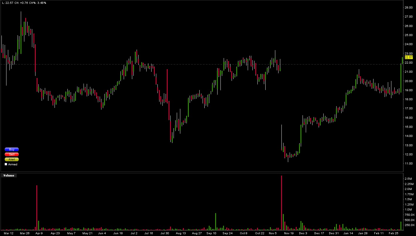 A vállalat jövőbeli kilátásai is nagyban kapcsolódnak ehez a készítményhez, remélhetőleg már 2013-ban képesek lesznek további sikeres tesztfázist publikálni. A Clovis Oncology részvényei jelenleg 22.57$-on kereskedhetőek.Amennyiben a napokban sikerülne áttörnie a 23-24$-os ellenállást akkor elképzelhető hogy már csak a 28$-os árszint lehet a határ.