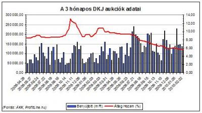 Még mindig 100 milliárd forint feletti érdeklődés övezi a Államadósság Kezelő Központ (ÁKK) 3 hónapos diszkont kincstárjegy aukcióját, a mai aukción a korábbi stagnálás után újra csökkenő hozamszint született. Az átlaghozam 5 bázisponttal 5,65 százalékra mérséklődött, utoljára ilyen alacsonyan 2003 januárjában állt.