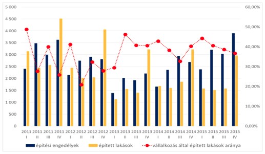 Építési engedélyek, épített lakások száma és a vállalkozások által épített lakások aránya Magyarországon 2011 - 2015