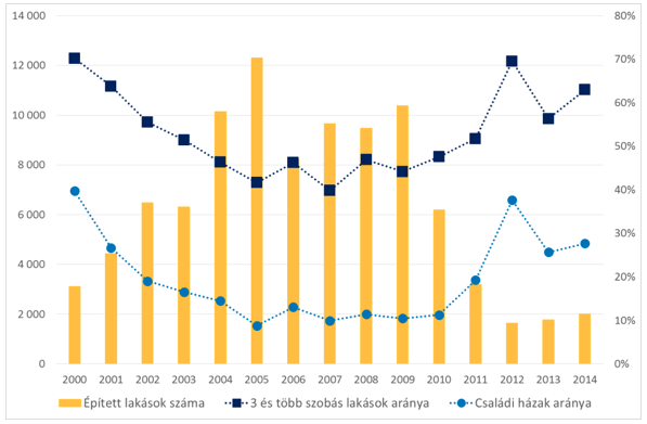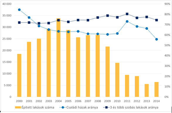 A 2000-2015-ös időszakot vizsgálva 2004-ben épült a legtöbb lakás; közel 44 ezer Magyarországon, ebből vidéken 33 761. A legszűkebb esztendő lakásépítés szempontjából 2013 volt, amikor 5 523 új lakást regisztrált a KSH vidéken, országosan pedig 7 213-at. A lakások döntő többsége családi ház formájában épült meg, emiatt az épített lakások számától függetlenül az évtized folyamán végig magas volt a három és több szobás lakások aránya az új építésű lakások között. Az átlagos alapterület vidéken a válságot megelőző, magasabb lakásszámokkal jellemezhető évek során is 95-100 m2 között, míg a válság beköszöntével, a drasztikusan csökkenő lakásépítési számok mellett egészen 112 m2-ig ugrott meg (2011-ben) és végig 105 m2 felett volt.