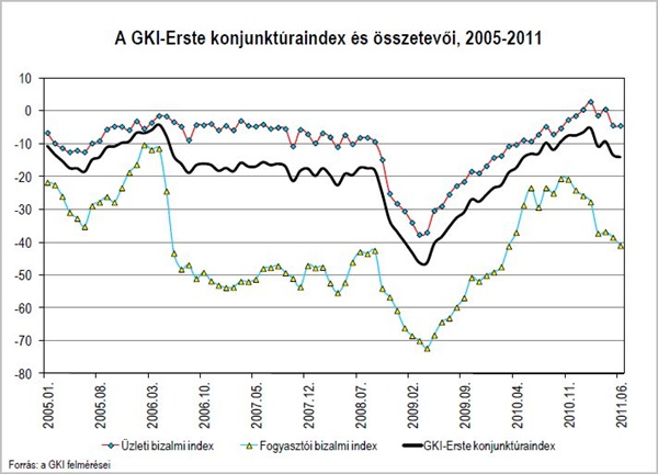 Az index júliusban mínusz 16,0 pontra esett az előző havi mínusz 13,9 pontról, hasonlóan alacsony szinten az index utoljára tavaly áprilisban volt, akkor mínusz 17,3 pontot mértek. Az üzleti bizalmi index a júniusi mínusz 4,4-ről mínusz 6,9 pontra esett, a fogyasztói pedig a mínusz 41,0 pontról mínusz 42,0 pontra csökkent. Júliusban az üzleti szférán belül az ipari és építőipari várakozások egyaránt érezhetően romlottak, a kereskedelmi és szolgáltató cégeké viszont ennél kisebb mértékben javult.
