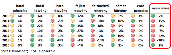 2015-től sokan a nyersanyagpiac helyreállását várták, ezzel szemben - a kitermelési verseny erősödése és a kínai növekedés lassulása miatt - elmaradt a jó teljesítmény. „A piacok jellegzetessége, hogy az eufória és a pesszimizmus is túlzottan el tud uralkodni. Azonban ha egy befektetési eszköz túl messzire elmegy akár pozitív, akár negatív irányba, törvényszerű, hogy onnan vissza is korrigál. Kedvező befektetési lehetőségeket keresve ezért érdemes megnézni a tartósan alulteljesítő eszközöket, és azt megvizsgálni, fennáll-e még az esést okozó fundamentális ok, vagy lassan elindul a korrekció” - mondta el Horváth István, a K&H Alapkezelő befektetési igazgatója.