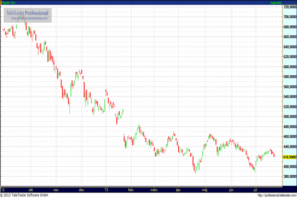 Ugyanakkor a vállalat jelenlegi negyedévre vonatkozó árbevétel előrejelzése némiképp elmaradt az elemzők jelenlegi konszenzusos becslésétől. Az Apple 3,05 dollárban deklarálta a részvényenkénti osztalék mértékét is, amelyet augusztus 15-én fizetnek a részvényesek számára. A tegnapi kereskedés során az Apple árfolyama 1,72 százalékkal 418,99 dollárra csökkent, ugyanakkor a tőzsdeidőn túli elektronikus kereskedésben 3,91 százalékkal 435,38 dollárra emelkedett. A vállalat árfolyama 40,57 százalékot esett a tavaly szeptember 21-én elért mindenkori csúcsnak számító 705,07 dollárhoz képest.