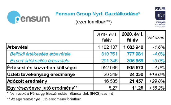A Pensum Group Nyrt. a COVID-19 járvány ellenére kiemelkedően jó első félévet zárt. A koronavírus általános negatív gazdasági hatásait a vállalat árbevételében érezni lehetett ugyan, de azok a vártnál jóval enyhébbek voltak. Ennek oka, hogy a Pensum partnerei között nem szerepelnek a válság által jelentősen sújtott üzleti szektorban működő cégek (autóipar, turizmus, vendéglátás), ugyanakkor a növekedést mutató ágazatokban (pl. kiskereskedelem, ételkiszállítás) a vállalat nagyobb forgalmat realizált. Összességében a járvány negatív hatásai az átlagnál kevésbé érintették a Pensumot, így árbevétele alig változott, 1,084 milliárd forint (-1,6%) volt az első hat hónapban. A kis mértékű visszaesést a belföldi árbevétel 4 százalékos csökkenése és az export árbevétel 5 százalékos növekedése okozta. Mindezek mellett a társaság gyorsan és hatékonyan reagált a költségek terén a vírus miatti bizonytalan üzleti kilátásokra: a belső állományt csökkentette, és a munkafolyamatok átszervezésével hatékonyabbá tette a működést. A Pensum felkészülten állt át az otthoni munkavégzésre, amely jelentős előnnyel is járt: sokkal jobban mérhetővé vált a hatékonyság, ami további átszervezésekhez vezetett, és még költséghatékonyabbá tette a működést. Az értékesítés közvetlen költségei 4,9 százalékkal 905 millió forintra estek, mindezek hatására a Pensum Group üzleti tevékenységének eredménye 19,6 százalékkal 24,3-ra, míg adózott eredménye 29,8 százalékkal 21,5 millió forintra emelkedett. A mutatók alapján a vállalat egy részvényre jutó eredménye 36,2 százalékkal 11,26 forintra bővült.