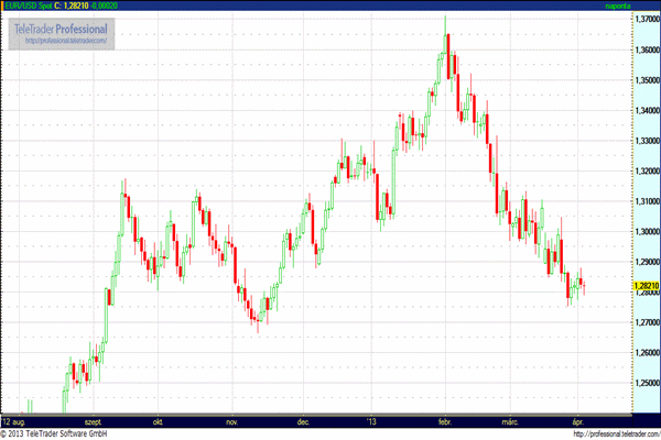 EUR/USD (1,2740 – 1,2860): A tegnap 1,28 fölé stabilan erősödő euro már a múlté, jelenleg 1,28 körül vergődik a közös pénz. A fordulót a rossz olasz PMI adat jelentette. Az európai beszerzési menedzser indexek összességében nem alakultak rosszul, mégis a piac az olasz publikációra figyel igazán, a periféria gondjaira koncentrál. A problémaforrások sorához Szlovénia is csatlakozni látszik, mivel a tavalyi év 2,3%-os GDP csökkenését követően a szlovén jegybank a 2013-as előrejelzését is közel 2%-os kontrakcióra rontotta.