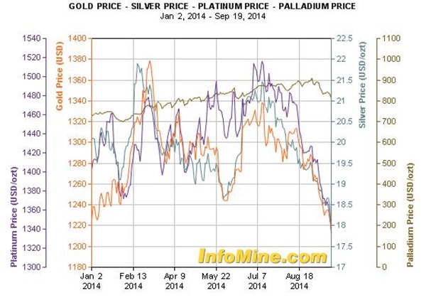 Az arany (piros vonal), az ezüst (kék vonal), a platina (lila vonal) és a palládium (barna vonal) idei árfolyamalakulása