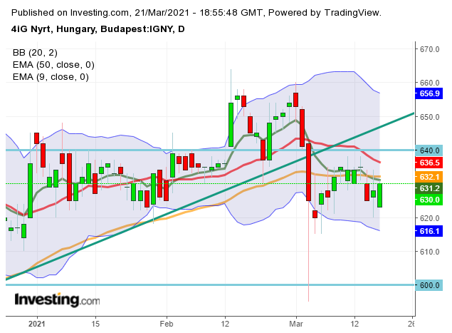 A 4IG már-már közel járt a korábbi 600 fornintos mélypontjának teszteléséhez, végül mégiscsak visszapattant a kurzus és a 640 forintos ellenállás felé fordult. Azzal, hogy egyelőre kitart a jegyzés és nem készítettek alacsonyabb aljat a medvék, technikailag a vevők oldalára hajthatja a sikert, más kérdés, hogy egy újabb lefordulás után mekkora erővel lépnek a tettek mezejére az eladók a következő napokban.