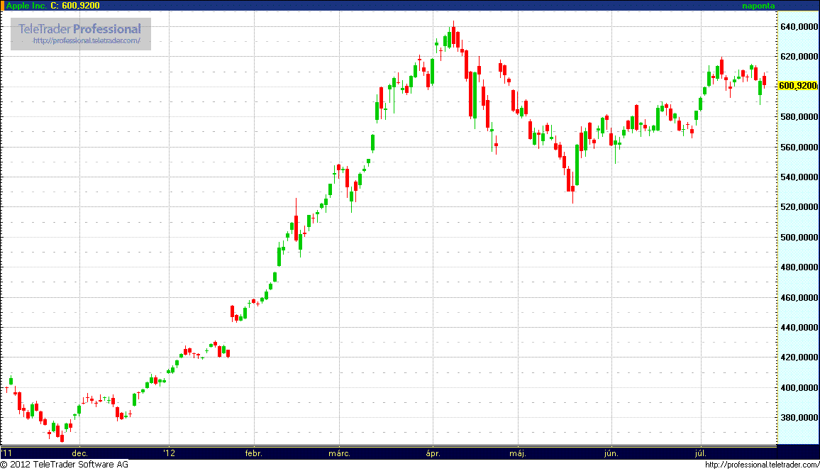 Az Apple árfolyama a gyorsjelentés után a piaczárás utáni elektronikus kereskedésben 5,5 százalékkal 567,80 dollárra esett. A rendes kereskedés során előtte 0,48 százalékkal 600,92 dollárra mérséklődött.