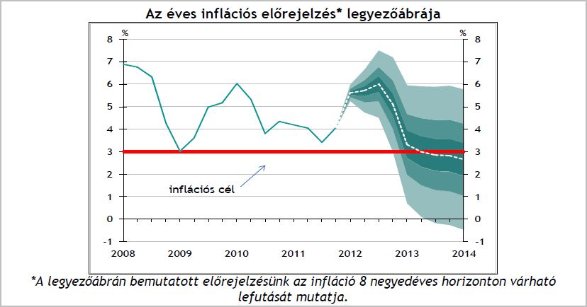 Az MNB szakértői stábja által készített és ma közzétett új inflációs prognózis a 2012-re vonatkozó korábbi 5,0 százalékos előrejelzését a fogyasztó áremelkedésre 5,6 százalékra emelte, a jövő évit pedig 2,6 százalékról 3,0 százalékra módosította.