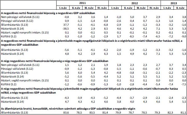 Az államháztartás nettó finanszírozási képessége a 2013 második negyedévével záruló elmúlt egy évben a GDP -2,3 százaléka (-659 milliárd forint) volt. 2013 második negyedévében az államháztartás nettó finanszírozási képessége a negyedéves GDP -1,6 százalékát tette ki (-115 milliárd forintot). Az államháztartás bruttó, konszolidált, névértéken számításba vett (maastrichti) adóssága 2013 második negyedévének végén a GDP 81,1 százaléka volt (23249 milliárd forint). Az első negyedév végén az államadósság a GDP 82,3 százaléka volt. Az adósság a második negyedévben 98 milliárd forinttal csökkent, ami 216 milliárd forintnyi nettó hitelfelvétel és a forint 314 milliárd forintos erősödésének egyenlegeként alakult ki. Az államháztartás nettó tartozása (17666 milliárd forint) a GDP 61,6 százalékát tette ki 2013 második negyedévének végén.