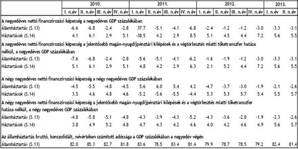 Az államháztartás nettó finanszírozási képessége az előzetes adatok szerint 2013 második negyedévével záruló elmúlt egy évben a GDP -2,6 százaléka (-749 milliárd forint) volt. 2013 második negyedévében az államháztartás nettó finanszírozási képessége a negyedéves GDP -3,1 százalékát tette ki (-221 milliárd forintot).