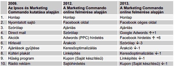 A legjelentősebb változás, hogy Facebook hirdetés hat helyet lépett előre az elmúlt évhez képest és ötödikként bekerült a tíz leggyakrabban használt marketing eszköz közé. A válaszadók 34 százaléka nyilatkozott úgy, hogy rendszeresen hirdet a Facebookon - a múlt évben 22 százalék volt az arány.