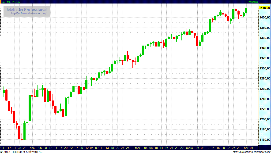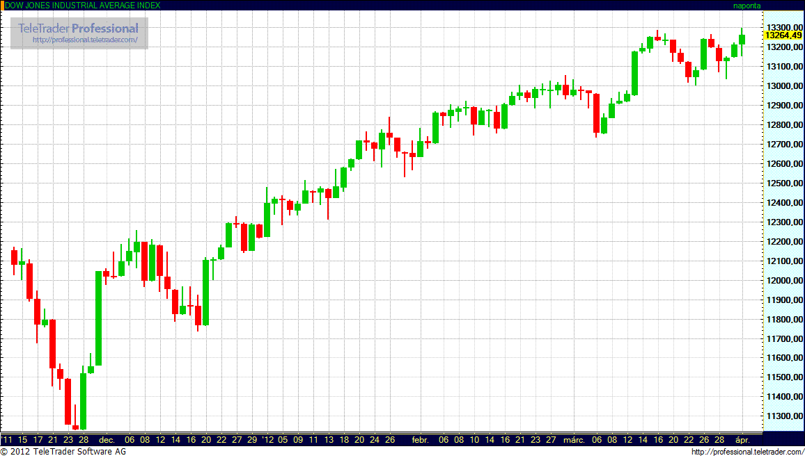 A tőzsdemutatók több mint két éve a legerősebb negyedévet zárták pénteken. A befektetők derűlátásában sincs változás, tovább javította a hangulatot, hogy márciusban az amerikai feldolgozóipari beszerzési menedzser index a vártnál nagyobb mértékben javult, miközben a kínai feldolgozóipari beszerzési menedzser index 11 havi csúcsra emelkedett, még vasárnapi bejelenés szerint. Az általános derűlátáson azt sem rontott, hogy három havi mélypontra csökkent az euróövezeti feldolgozóipari beszerzési menedzseri index márciusra, miközben az euró 1999. évi bevezetése óta a legmagasabb szintre nőtt a munkanélküliség februárban az eurózónában.