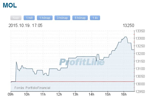 A Mol 235 forinttal, 1,81 százalékkal 13 250 forintra erősödött, 890,0 millió forintos forgalomban. Az OTP-részvények ára 55 forinttal, 0,97 százalékkal 5615 forintra csökkent, forgalmuk 1,6 milliárd forintot tett ki. A Magyar Telekom árfolyama nem változott 386 forintot ért, forgalma 169,1 millió forint volt. A Richter-papírok árfolyama 30 forinttal, 0,64 százalékkal 4670 forintra esett, a részvények forgalma 1,9 milliárd forintot ért el.