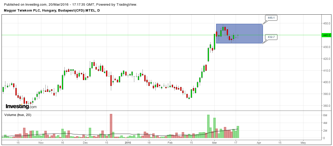 Még mindig a telekom-részvénye lehet a legalulértékeltebb magyar papír, így fél szemünket mindig érdemes rajta tartanunk. Érdemes behúzni a zászló alakzat lobogóját, ugyanis 450 áttörése újabb nagy ralit hozhat a részvénynek.