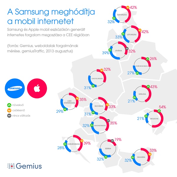Magyarországon a Samsung részesedése 27-ről 32 százalékra emelkedett egy év leforgása alatt. Bár az Apple készülékekről generált netes forgalom vezet, de a trend stagnáló. A Samsung erőteljes növekedési ütemének köszönhetően hamarosan itt is átveszi a vezető szerepet.