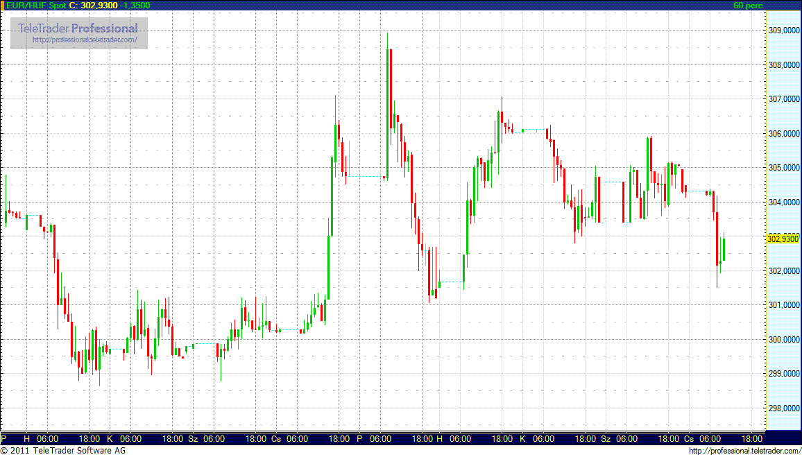 Csütörtök délelőtt fél tizenegykor az euró jegyzése 302,94 forinton állt a bankközi deviza kereskedelemben a szerda délutáni 303,88 forint után. Csütörtökre virradóra az árfolyam 304,50 forint környékén mozgott a nemzetközi deviza kereskedelemben.