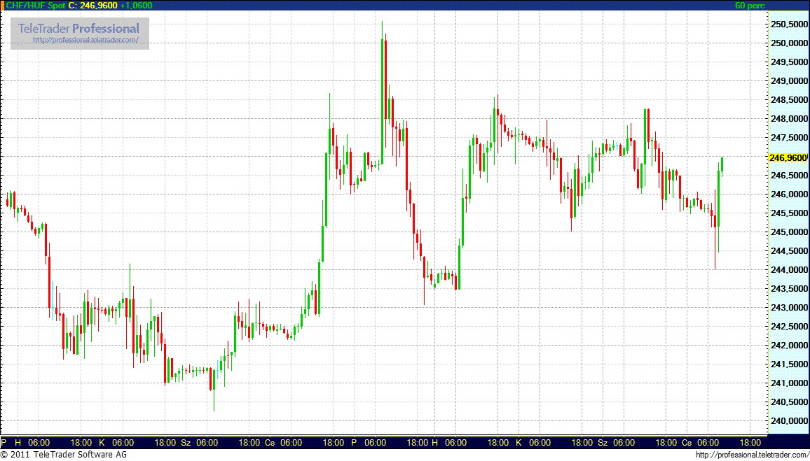 A svájci frank 246,86 forintos jegyzésen áll csütörtök délelőtt, szemben a szerda délutáni 246,52 forinttal. A svájci jegybank decemberi monetáris politikai értékelésének közzététele után a forint 245 forintos svájci frank jegyzésről 247-re gyengült, követve az 1,2350 svájci frankról 1,2280 frankra eső euró árfolyamot. A svájci jegybank megerősítette elkötelezettségét az 1,20-as euró/svájci frank árfolyam tűréshatár védelme mellett, valamint szükséges esetben további lépéseket helyezett kilátásba a frank erősödésének megakadályozására. A piacok a tűréshatár megemelését várták.