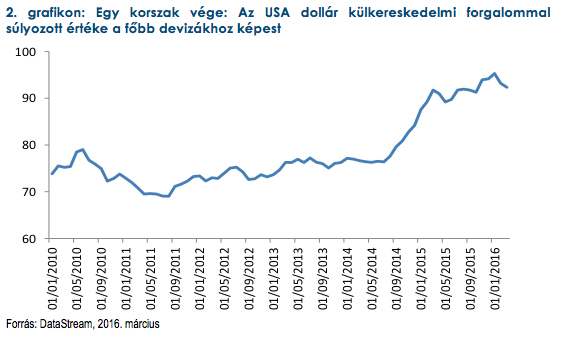 Ezzel el is érte, amit akart: megállította az euró gyengülését. Eközben a Fednek is visszakoznia kellett a kamatemelések kapcsán decemberben kitűzött – és túlzott lendülettel megkezdett – úton. Módosított álláspontja (ebben a naptári évben négy kamatemelés helyett csak kettőt fog végrehajtani, ld. 1. grafikon) immár egybecseng a piaci várakozásokkal, és eredményeképpen a dollár árfolyama meg is indult lefelé. Dominic Rossi nem gondolja, hogy az USA dollárnak a Fed ülése utáni árfolyamcsökkenése bármifajta érdemi leértékelődési trend kezdetét jelentené, azt viszont igen, hogy az elmúlt két évben (és főleg 2014 közepe óta, ld. 2. grafikon) tapasztalt dollár-felértékelődés véget ért. Ez azonnal kedvezőbbé tette a pénzügyi körülményeket, és várhatóan azt is lehetővé teszi, hogy a pénzpiacokon tapaszalt, fokozott volatilitás is alábbhagyjon.