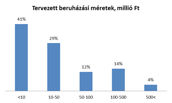 A beruházást tervező cégek 41%-a leginkább 10 millió Ft alatti összegben szeretné fejleszteni vállalkozását, a válaszadók 18%-a azonban ennél nagyobb mértékű, 100 millió Ft feletti beruházást kíván megvalósítani a következő három évben. Ugyancsak pozitív változás, hogy a márciusi kutatási eredményekhez képest átlagosan 10-ből legalább 6 vállalkozás akkor is megvalósítaná tervezett beruházásait, ha nem szerepelne sikeresen a pályázaton (22%-os növekedés).