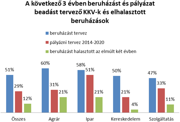 A kkv-k harmada tervezi legalább egy pályázat benyújtását. Az új ciklusban megnyíló pályázati lehetőségekre várva az elmúlt két évben a vállalkozások 12 százaléka, átlagosan 50-100 millió Ft mértékű beruházást – elsősorban a nagyobb értékű ipari és agrárberuházásokat – halasztott el. Az uniós forrásokkal kapcsolatos tájékozódásban minden eddiginél többen, a vállalkozások 59%-a nyitott a banki segítségre.