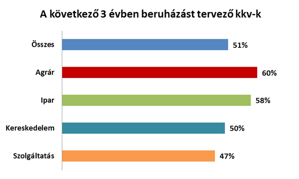 A hazai kis- és közepes vállalkozások fele tervez a következő három évben beruházást, ez a hajlandóság az agrárszegmensben és a 200 millió Ft feletti árbevétellel rendelkező cégek körében a legerősebb.