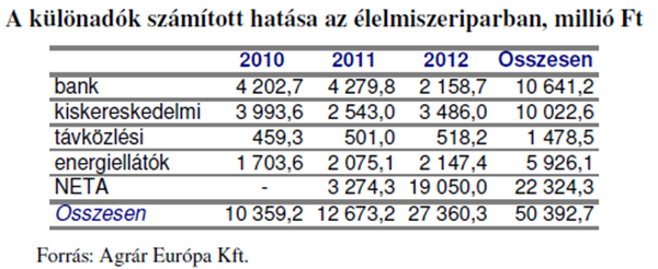 Összesen több mint 50 milliárd forintos többletköltséget okoztak az élelmiszeriparnak a különadók az elmúlt év végéig. Az Agrár Európa Kft. friss tanulmánya sorra veszi az élelmiszeripart sújtó terheket: az ágazat a költségek áthárítása miatt bankadót, telekommunikációs adót, továbbá az energetikai cégeket, valamint a bolti kiskereskedelmet terhelő (2013-tól már kivezetett) különadókat is megfizeti, ráadásul 2011-ben bevezették a népegészségügyi termékdíjat (NETA) is.