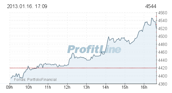 A Mol 5 forinttal, 0,03 százalékkal 18 405 forintra erősödött, 1,3 milliárd forintos forgalomban. Az OTP részvények ára 124 forinttal, 2,81 százalékkal 4544 forintra nőtt, forgalmuk 14,6 milliárd forintot tett ki. A Magyar Telekom árfolyama 2 forinttal, 0,50 százalékkal 404 forintra emelkedett, forgalma 400,3 millió forint volt. A Richter papírok árfolyama nem változott 37 100 forintot ért, a részvények forgalma 909,4 millió forintot ért el. A másik gyógyszeripari részvény, az Egis 153,3 millió forintos forgalom mellett 20 forinttal, 0,11 százalékkal 18 120 forintra növelte értékét.