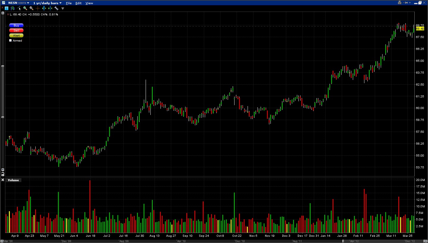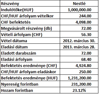 Egy évvel ezelőtt, 2012. március 30-án egy Nestlé részvényért még 56,30 frankot kértek a svájci tőzsdén. Jelenleg ez az árfolyam már 68,40 frankon áll, ezzel pedig 21 százalékos teljesítményt ért el a vállalat.