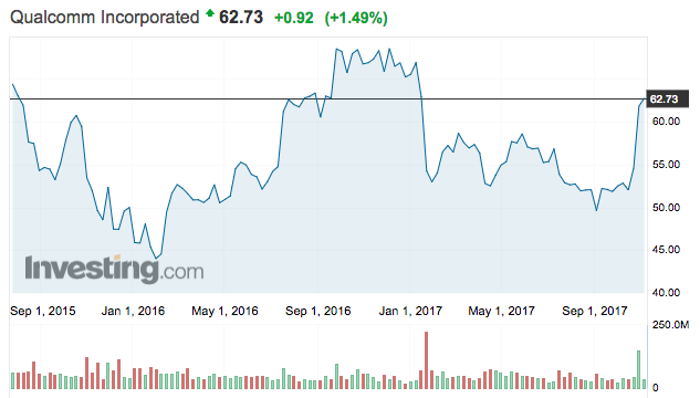 Belső források szerint a Qualcomm azt fogja javasolni részvényeseinek, hogy ezen az áron ne hagyják jóvá a tranzakciót, ugyanis ez túl alacsonyra értékeli a vállalatot. Ebben szerepet játszik az Apple-el folytatott jogi vita is, mely komoly bizonytalanságot gerjeszt, de a Qualcomm menedzsmentje valószínűleg kedvezőbben ítéli meg a helyzetet, mint az egyéb szereplők. Minden bizonnyal ezt használná most ki a Broadcom. Mindenesetre a konkrét felvásárlási ajánlatra a Qualcomm tovább emelkedik a mai piacnyitás előtt, nagyjából 65 dollár környékén nyithat az árfolyam.