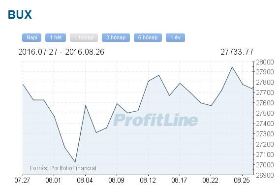 A Budapesti Értéktőzsde részvényindexe, a BUX 45,85 pontos, 0,17 százalékos csökkenéssel, 27 733,77 ponton zárt pénteken. A részvénypiac forgalma 4,2 milliárd forint volt. A Mol 5 forinttal, 0,03 százalékkal 17 280 forintra csökkent, 1,1 milliárd forintos forgalomban.
