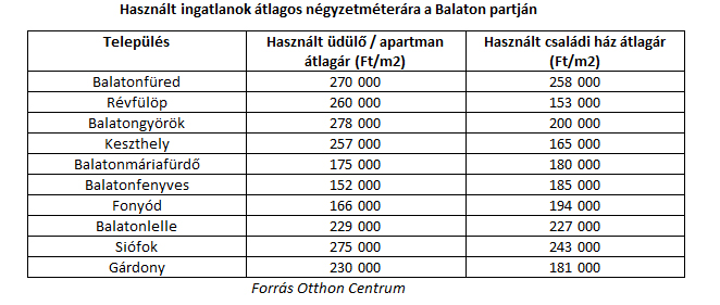 A használt ingatlanok piacán a legfelkapottabb város továbbra is Siófok és Balatonfüred. A két városban a legmagasabbak az ingatlanárak, jelenleg Füred kicsit drágább, ahol a családi házak négyzetméterára éppen meghaladta a 250 ezer forintot, míg Siófok kicsivel alatta maradt (243 ezer forint). A tópart közelében az átlagnál magasabb, attól távolabb már jóval alacsonyabb árak jellemzőek. A nyugati medencében, a két várostól távolodva csökken a családi házak négyzetméterára és a legtöbb településen 150 ezer Ft/m2 az elmúlt egy évben kialakult ár, de Badacsonyban és környékén, ennél magasabb, 190 ezer forintos fajlagos ár volt a meghatározó.