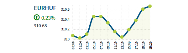Az eurót 18.30 óra tájban 310,64 forinton jegyezték a kora reggeli 310,44 forinttal szemben. A dollár 259,73 forintról 258,41 forintra, a svájci frank pedig 265,43 forintról 265,23 forintra gyengült.