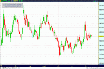 A magyar piac indulásakor 278,50 forint körüli jegyzésekről lefelé indult az árfolyam. A kereskedők szerint az év vége közeledtével egyre alacsonyabb az ügyfelek érdeklődése a piacon. Emiatt mérsékelt forgalomra és szűk sávban mozgó árfolyamokra számítanak