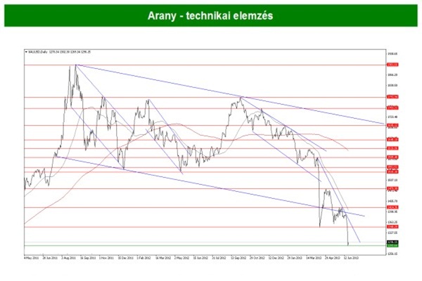 Az aranyár beszakadása gyorsan és fájdalmasan ment végbe. A zuhanás egyelőre 1.270 dollár magasságában állt meg, majd a hét utolsó kereskedési napján az árfolyam enyhén és erőtlenül felfelé korrigált. Valószínű tehát, hogy az esésnek ezzel még nincs vége. Miután az 1.320 dollár körüli támaszszintet heti záróáron is alulmúlta az árfolyam, technikailag ki kell jelenteni, hogy az arany évtizedes emelkedő trendjének az elmúlt héten vége szakadt. Ez nem jelenti automatikusan máris egy hosszútávú csökkenő trend kezdetét, egyelőre csak annyi bizonyos, hogy a mostani történések technikailag a senki földjén zajlanak majd. A legvalószínűbb az elkövetkezendőkben egy egyértelmű trend nélküli ingázás lehet, amíg ki nem alakul egy minden kétséget kizáró irány. A következő érdemi támaszszintre 1.255 dollár környékén lehet számítani, de még ennél lejjebb is mehet az árfolyam, hiszen az 1.311 dolláros vagy e feletti támaszok is könnyedén törtek a teher alatt.