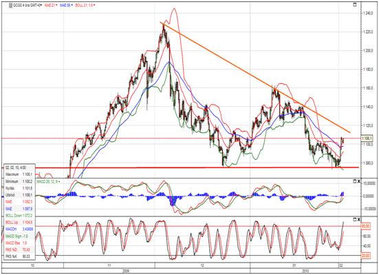 Felülről ellenállást jelenthet 1110$-nál az eső trendvonal. Annak eleste újabb emelkedést hozhat a piacra, aminek ellenállása 1140$-nál, illetve 1160$-nál lenne megtalálható. Amennyiben elesne az 1075 dolláros árfolyam, 1027$-ig is visszakorrigálhatnának az árfolyamok.