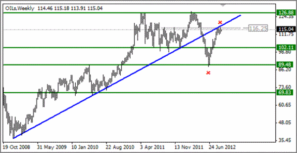 Technikai Elemzés : Ez az olajpiaci konszolidáció soros hete A Brent típusú olaj hordója a 116,25 USD szinten ragadt le, ahol a klasszikus ellenálláson kívül a bikák számára korlátot képező, korábban áttört növekedési trendvonal is található Amennyiben a fent leírt helyek hatékonyan feltartóztatják a kereslet előrenyomulását, akkor hordónként 102 USD környéke körüli áresésre lehet számítani.
