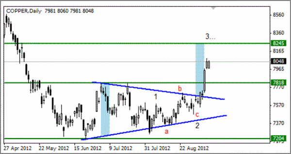 Az utóbbi napokban a rézjegyzések folyamatos emelkedését figyelhetjük meg. Ehhez a mozdulathoz technikai oldalról hozzájárult mind a második hullámon száguldó korrekció befejezése, mind a háromszög alakzatból felülről kitörés, s az ellenállás áttörése a 7818. ponton.