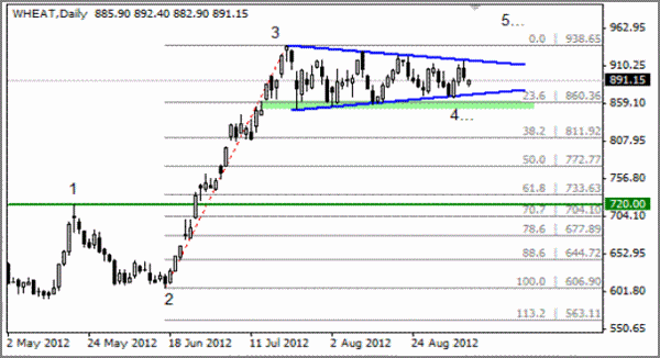 Technikai Elemzés : A búzapiacon továbbra is tart a melléktrend, amely jelen pillanatban egy szimmetrikus háromszög alakzatra emlékeztet. Felső és alsó korlátja továbbra is helyi ellenállásokat és támasztásokat képez a piac számára és majd csak valamelyikük áttörése kell hogy trendmozgás kialakulásához vezessen Viszont a hullám jelölések oldaláról nézve továbbra is kialakulhat itt egy ötödik, 940 USD környékére mutató emelkedő hullám.