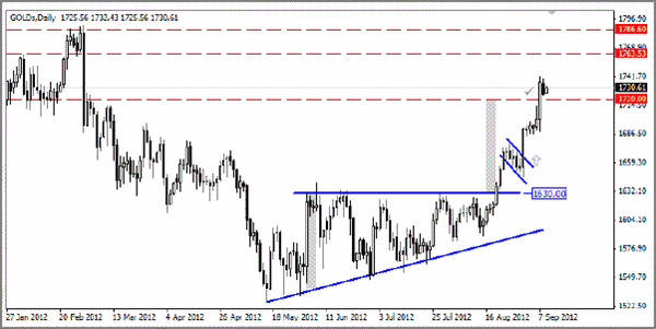 Az Európai Központi Bank döntése illetve az amerikai munkaerő piaci adatok enyhén csalódást keltő hatására az aranyárak folytatják a felfele masírozást. A nemesfémek jegyzése szempontjából jelen héten a legnagyobb jelentősége az amerikai FED ülése után tervezett csütörtöki bejelentésnek lesz illetve Ben Bernanke elnök sajtótájékoztatójának. Hogyha a csütörtöki bejelentésnek hasonló kicsengése lesz mint az elmúlt hónapokban hallhatóaknak (intervenciós készség deklarálása konkrétumok nélkül), ilyen nagy emelkedések után megnőhet a nemesfémek erős korrekciójának a valószínűsége.