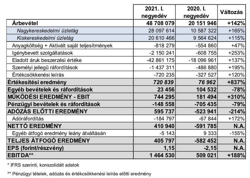 Az első negyedév növekvő hatékonyság mellett zajlott le az AutoWallis Csoportnál: az árbevétel növekedésének mértéke meghaladta az eladott áruk beszerzési értéke (ELÁBÉ) ütemének növekedését, melynek eredményeképpen a társaság fedezet termelése 10,2 százalékról 12 százalékra növekedett az év első három hónapjában. A személyi jellegű ráfordítások 195 százalékos emelkedése a tavaly végrehajtott tranzakciók eredménye, amelyek következtében az AutoWallis Csoport átlagos statisztikai létszáma 330 fővel bővült, így 662-re nőtt. A pénzügyi bevételek és ráfordítások 79 százalékkal 149 millió forintra csökkentek a részben számviteli árfolyamveszteség csökkentése következtében. A kedvező árfolyamhatás mellett ugyanakkor a kamatráfordítások némileg nőttek, elsősorban a tavaly végrehajtott tranzakciók finanszírozása miatt. Mindezek hatására az AutoWallis menedzsmentjének megítélése szerint a társaság eredményét legjobban bemutató EBITDA 188 százalékkal 1,5 milliárd forintra nőtt, míg a teljes átfogó eredmény 406 millió forint nyereség lett, szemben az előző év 582 millió forint veszteségével. Ormosy Gábor, az AutoWallis vezérigazgatója elmonda, hogy az eredmény jelentős javulása a növekedési stratégiába illeszkedő akvizíciós és organikus növekedésnek, a fedezettermelés javulásának és a fegyelmezett költséggazdálkodásnak egyaránt köszönhető. A kilátásokat tekintve a vezérigazgató elmondta, hogy a társaság 2021-ben 230-253 milliárd forint közötti árbevétellel és 5,7-6,3 milliárd forint közötti EBITDA-val számol.