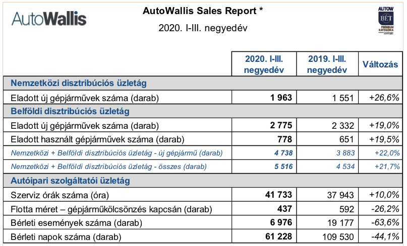 Az autóbérleti piac kivételével minden területen kedvező folyamatok voltak tapasztalhatóak az AutoWallis harmadik negyedévében, így a Budapesti Értéktőzsde autós cégének értékesítési tevékenysége már megközelítette és több esetben meg is haladta a koronavírus miatti gazdasági leállás előtti időszakban tapasztalt növekedési ütemet. A koronavírus-járvány kedvezőtlen gazdasági hatásai az autókölcsönzés területén még mindig tapasztalhatóak a turizmus és üzleti célú utazás drasztikus visszaesése miatt. Ormosy Gábor, az AutoWallis vezérigazgatója elmondta, hogy a csoport leányvállalatainak menedzsmentje a lehetőségekhez mérten az átmenetileg megváltozott környezethez igazította a kapacitásait. Egyúttal felkészülve várták a gazdaság újraindulásával az új, vagy elhalasztott igények kiszolgálását, ami a harmadik negyedévben már jelentkezett a készletről vásárlások és szervizelések pótlásában is. A vezérigazgató hozzátette, hogy emellett a harmadik negyedévben már organikus növekedés is tapasztalható volt, így mindent egybevetve 19-27 százalék közötti mértékben bővültek a hazai és a nemzetközi értékesítési számok az év első kilenc hónapjában a tavalyi hasonló időszakhoz képest, és a szervizkihasználtság területén is 10 százalékos bővülés volt tapasztalható. Ormosy Gábor kiemelte, hogy az AutoWallis ebben az időszakban is tovább folytatta az üzletfejlesztést, így összesen hat olyan akvizíciót jelentettek be itthon és a régióban, melyek közül az Iniciál Autóház és a Wallis Kerepesi számai részben már szerepelnek a mostani adatokban, de az összes akvizíció pozitív hatásai a 2021-es számokban jelentkeznek majd teljes egészében.